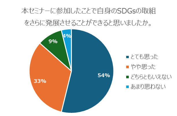 セミナー終了後のアンケートでは、86.5%の皆さまが、「本セミナーに参加したことで自身のSDGsの取組をさらに発展させることができると思った」と回答してくださいました。なお、データは、総合企画部政策企画課さまよりご提供いただきました。
