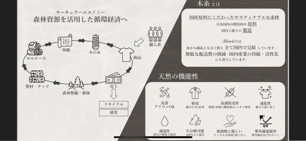 あとは、SDGsアパレルの事業も、会社としてこだわっているものです。もともと、林業に従事している方とお話しているなかから始まったんですね。林業は、現状、それだけではなかなか成り立たない厳しい状況にあります。そんななかで、廃材になるような木材から、糸を作るメーカーさんと出会いました。林業にも貢献できるよう、何回も何回も試行錯誤して、このすごい素材を、品質が良くデザインもかっこいいものに仕上げていきます。これもこだわりですね。